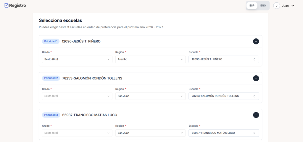 Una vez haya completado el perfil del estudiante, los formularios y los consentimientos, podrá en esta sección seleccionar las escuelas que estén dentro de las opciones disponibles por región y tengan el Programa Montessori.