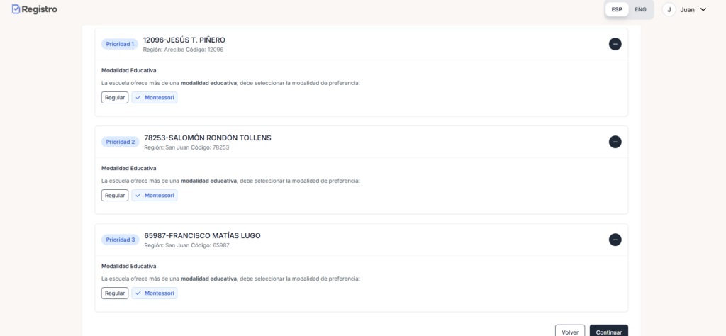 Después de seleccionar las escuelas de su preferencia, el sistema le mostrará las opciones de modalidad educativa. En este paso, podrá elegir si desea que el estudiante continúe en la modalidad regular o en el Programa Montessori.