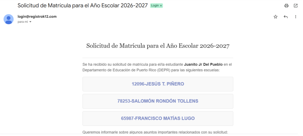 Recibirá un mensaje al correo electrónico con los detalles de la matrícula.