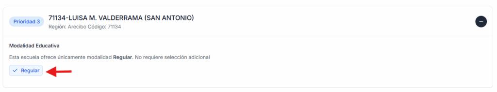 - Si la escuela solo tiene modalidad Regular, aparecerá ya seleccionada.