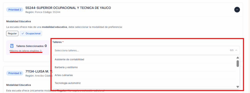 - Si ofrece Talleres Ocupacionales, podrá seleccionar hasta 3 talleres, según disponibilidad.