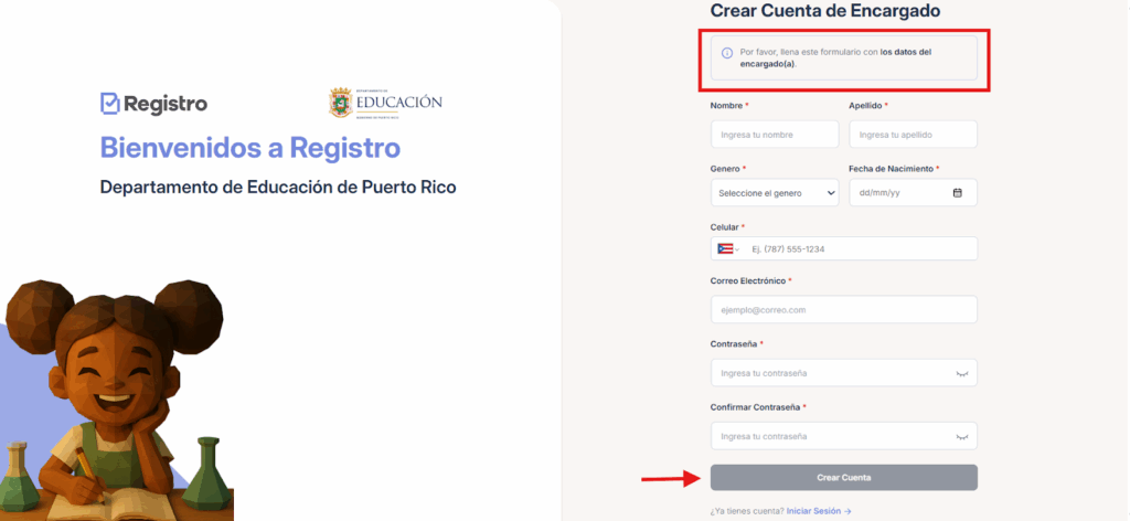Para crear una cuenta deberá ingresar la siguiente información del encargado(a):