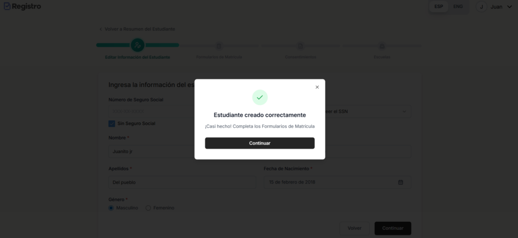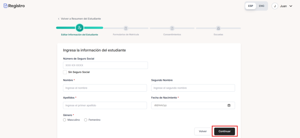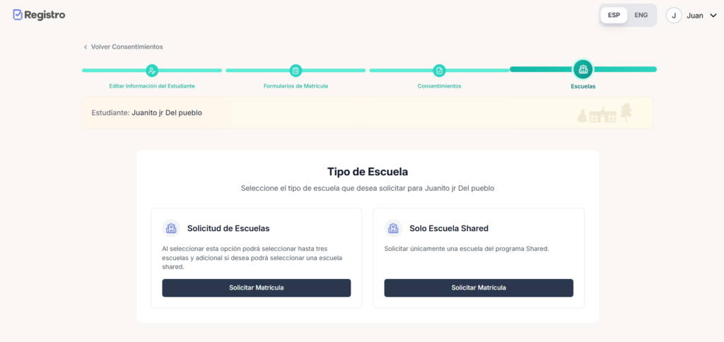 Después de seleccionar la escuela, presione “Continuar” para pasar a la pantalla de resumen de matrícula.