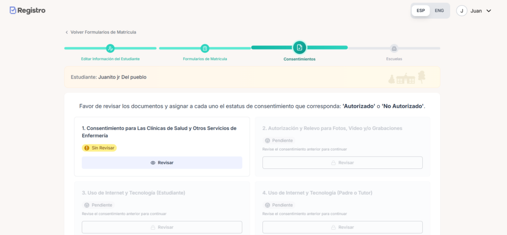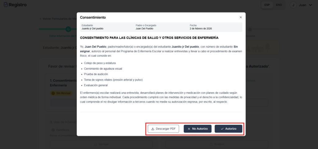 Cuando todos los formularios estén completos, deberá revisar y autorizar (o no) los consentimientos.