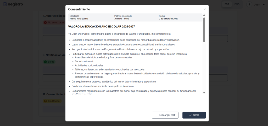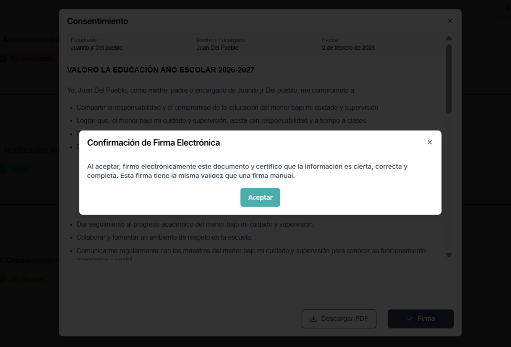 El último consentimiento incluirá la opción de “Firma”, donde confirmará que toda la información ingresada es verídica.
