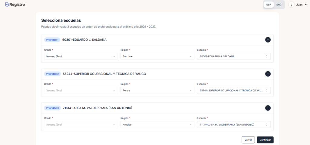 En la solicitud de escuelas deberá escoger el grado, la región y la escuela.
