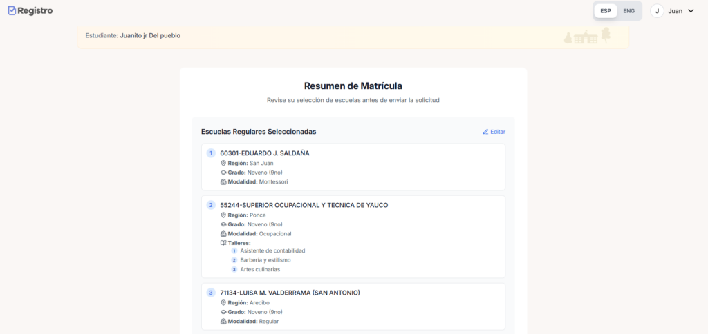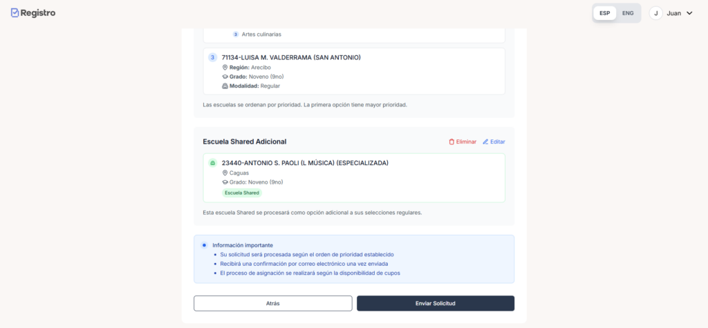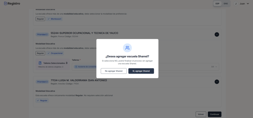 Si se escogió escuela Shared, ésta aparecerá abajo del resumen de las escuelas seleccionadas.