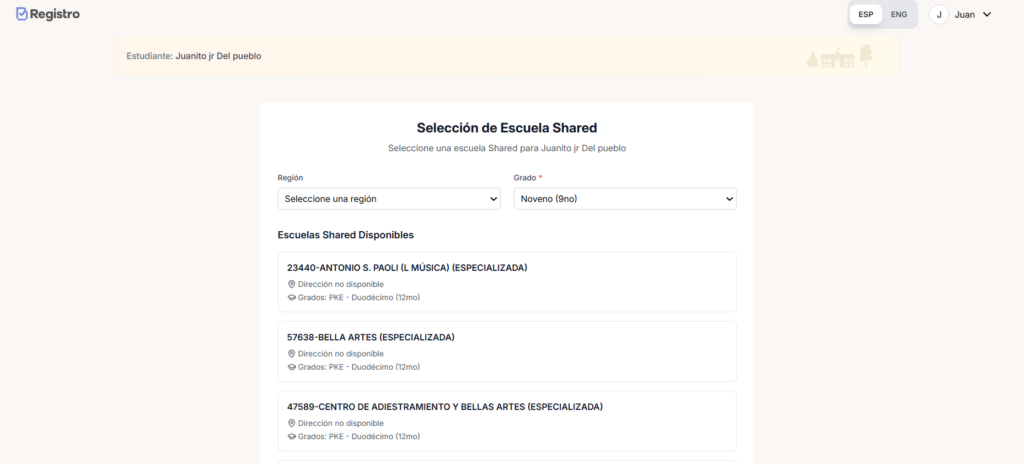 Si decide agregar una escuela Shared, se mostrará una lista desplegable con todas las opciones disponibles. También podrá buscar por región.