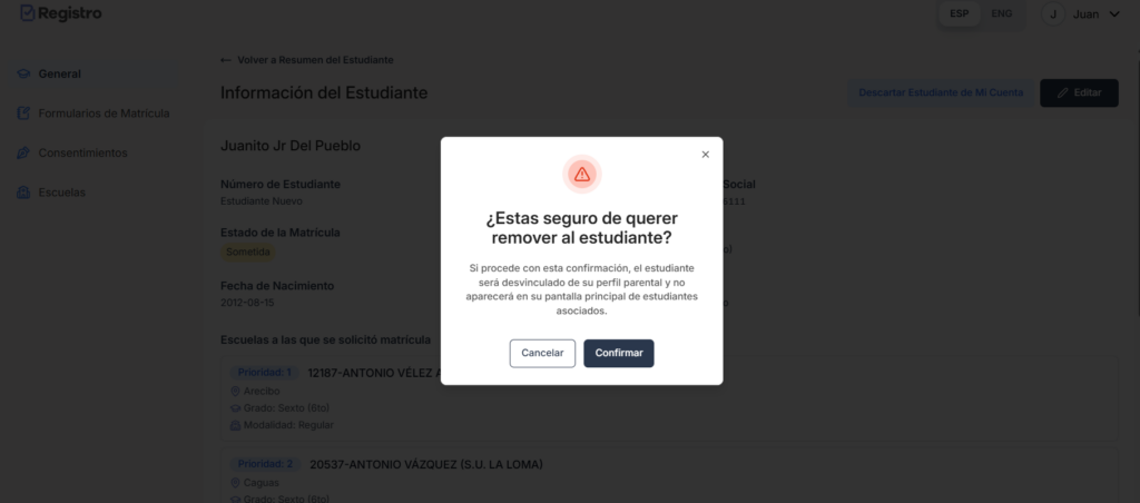 Una vez confirmado, el estudiante quedará desvinculado de su cuenta y ya no aparecerá en su perfil.