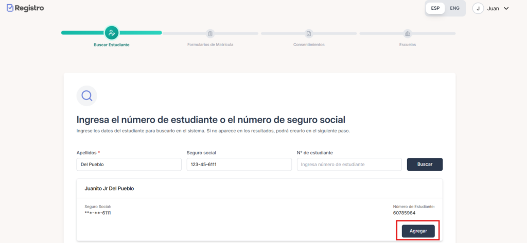 Realice la búsqueda correspondiente y haga clic en “Agregar” para acceder nuevamente al perfil del estudiante y a los formularios de matrícula.