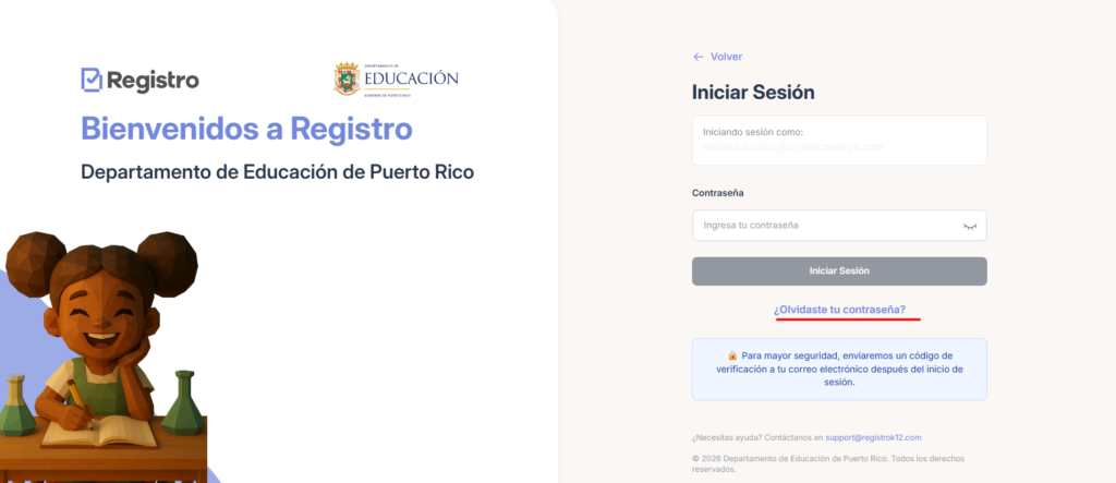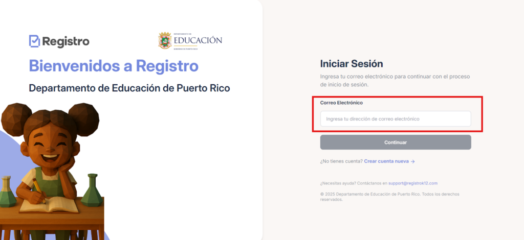 Acceda al portal de Matrícula en Línea (mimatricula.dde.pr) y escriba su correo electrónico en el campo correspondiente.