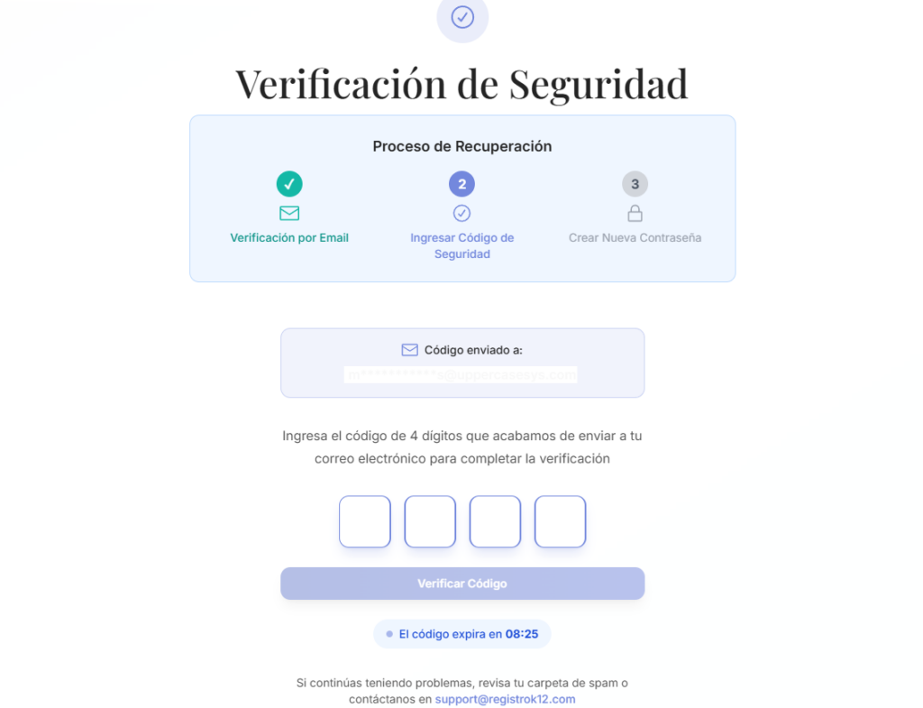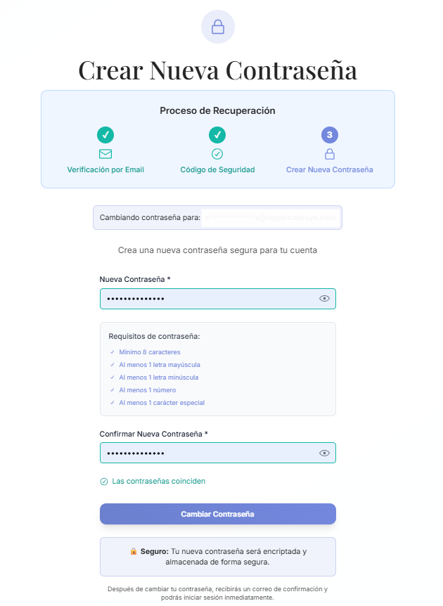 3. Una vez validado el código, proceda a crear su nueva contraseña, cumpliendo con los requisitos establecidos por la plataforma.