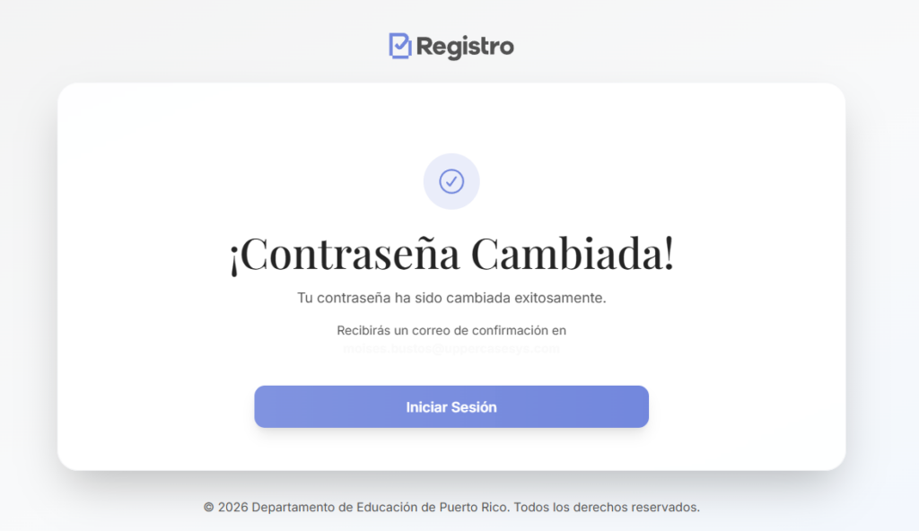 El sistema le mostrará un mensaje confirmando que el cambio de contraseña se realizó exitosamente.